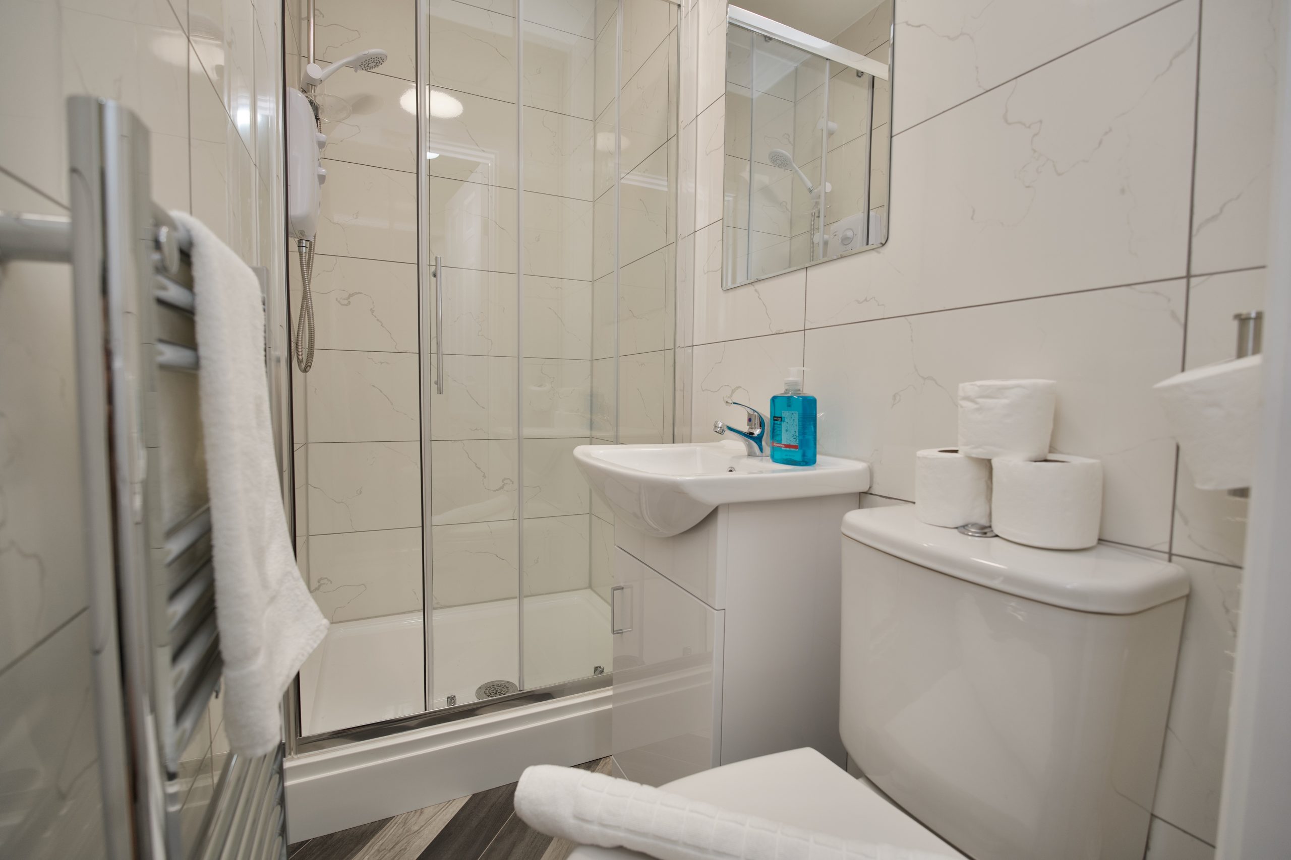 The private bedroom includes a comfortable double bed, bedside table, mounted Smart TV, and a clothes rail with storage. The modern shower room is fresh and functional.