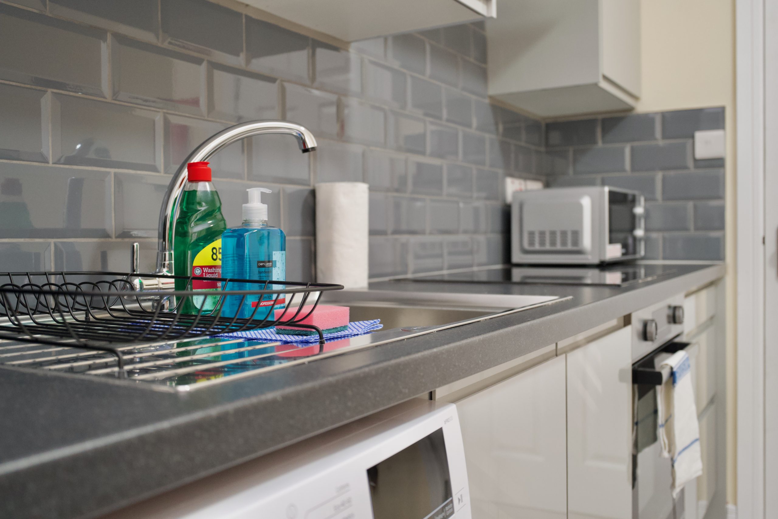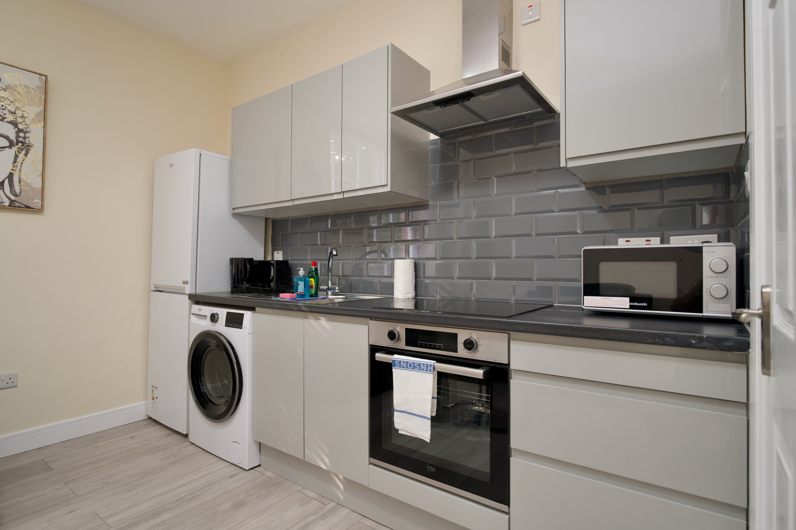 Cook at home in the fully equipped kitchen featuring a fridge, washer/dryer, oven, hob, microwave, toaster, kettle and a full set of crockery, utensils and cookware. Complimentary tea and coffee provided.
