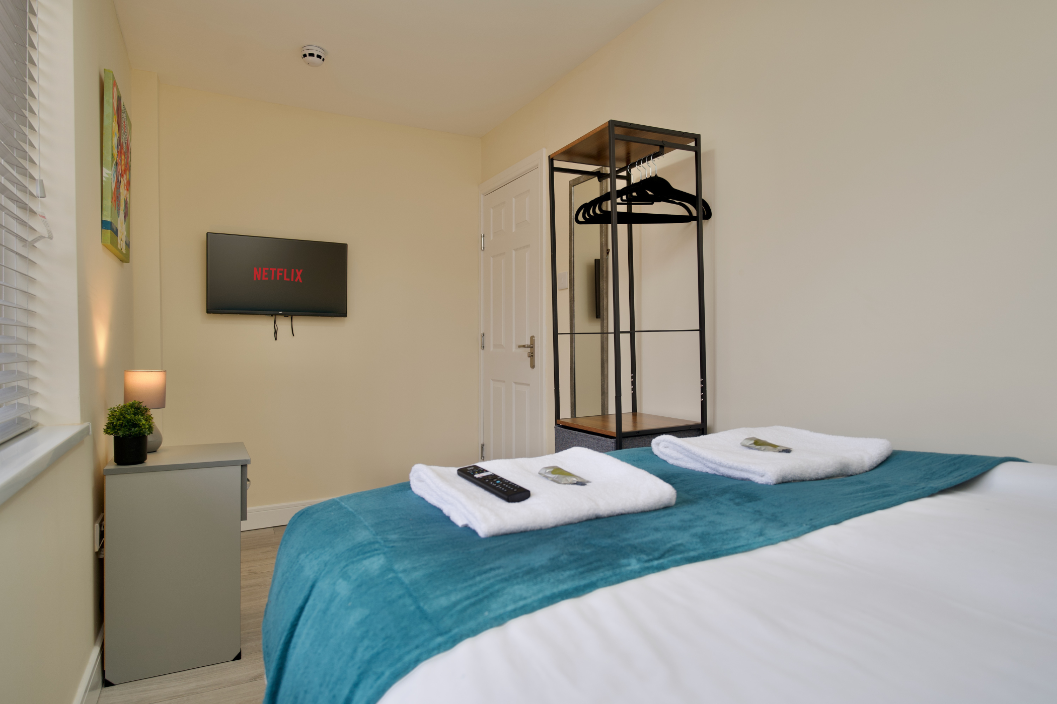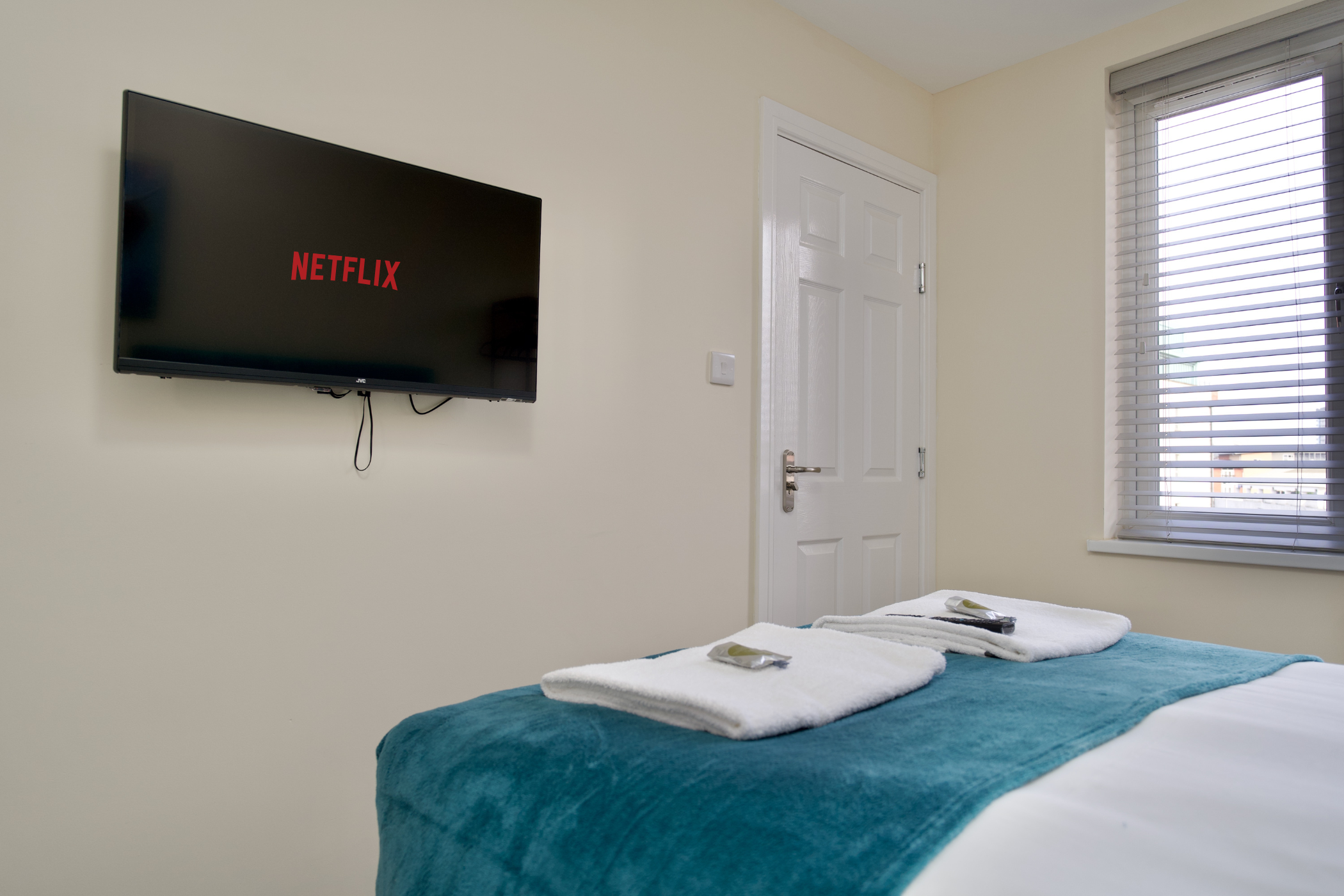 Bedroom 1 features a comfy double bed and wall-mounted Smart TV.