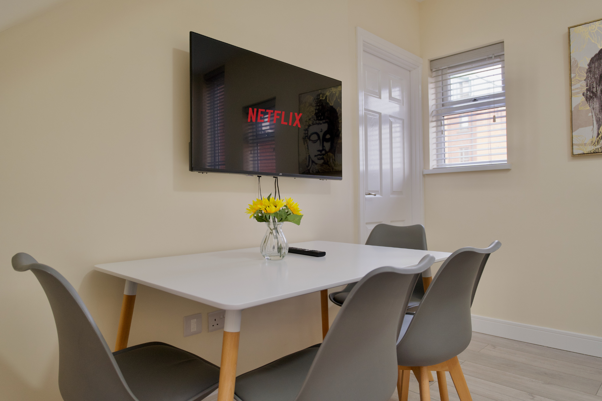 Relax in a bright and modern lounge with a comfy 3-seater and 2-seater sofa, a Smart TV, and a dining area that seats 4. The ideal space to unwind after a busy day.