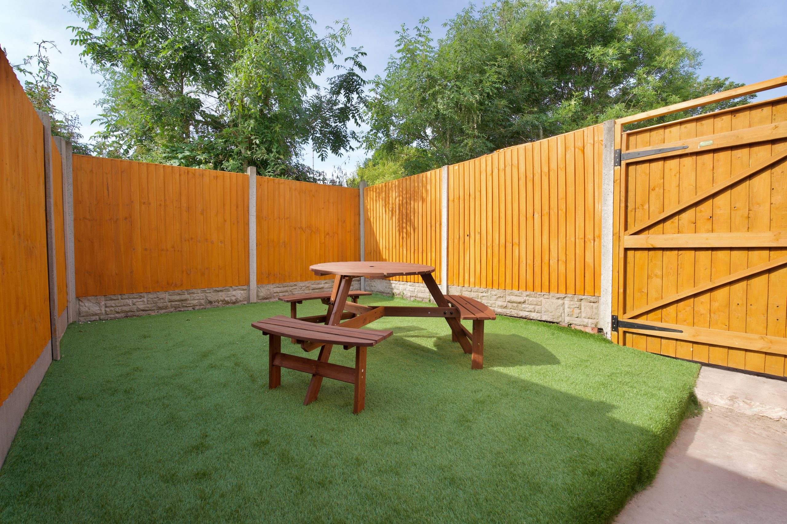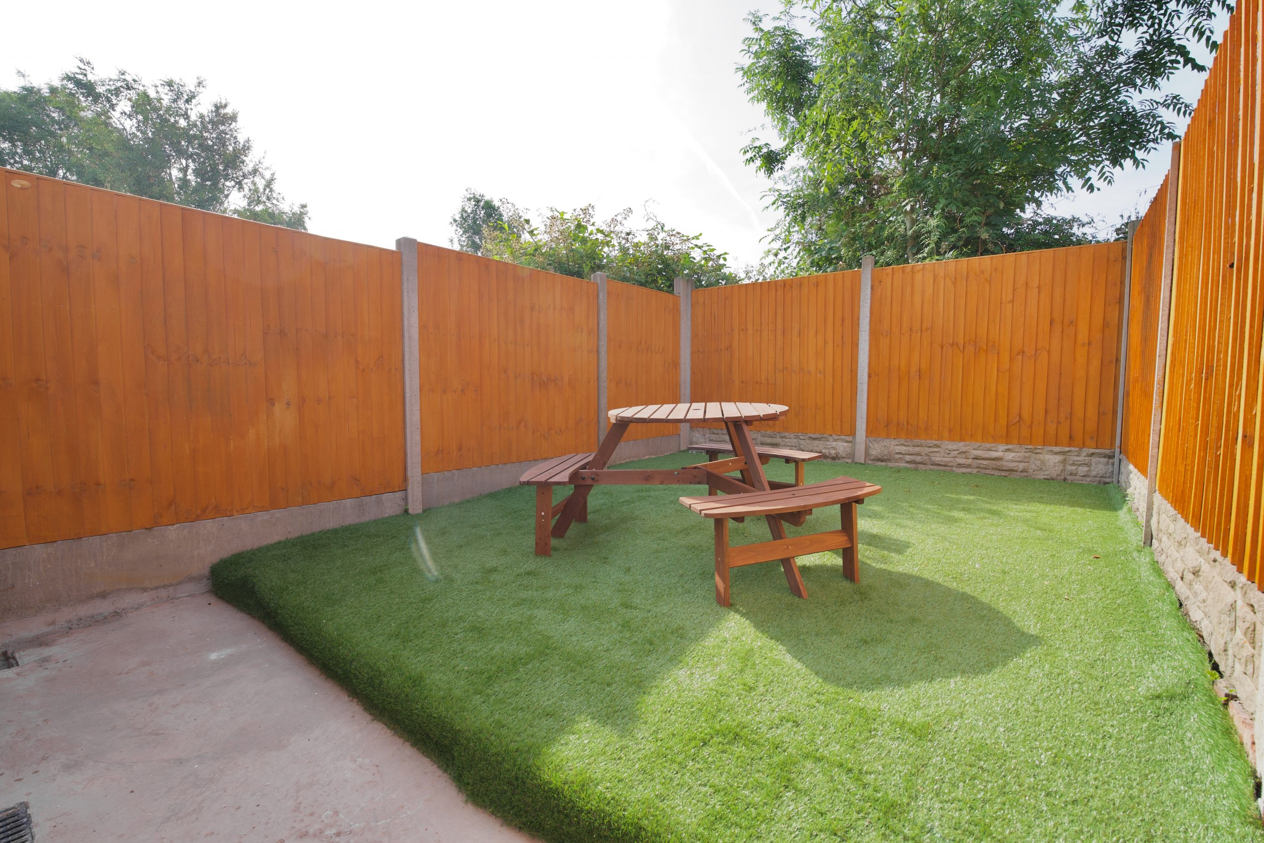 Step outside to the private, fully fenced rear garden – perfect for morning coffee or an evening meal. A bench and dining area make it ideal for enjoying the outdoors.
