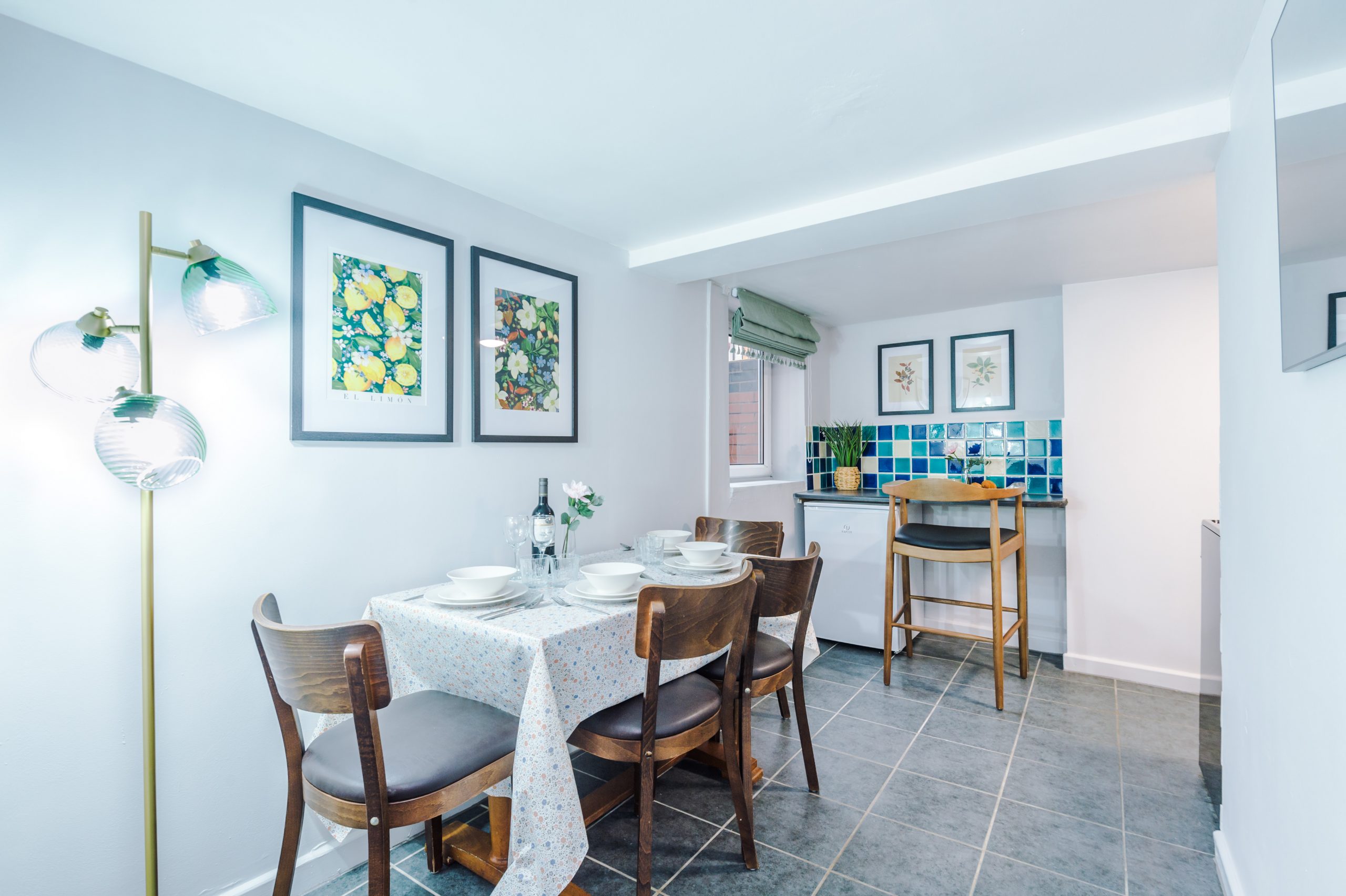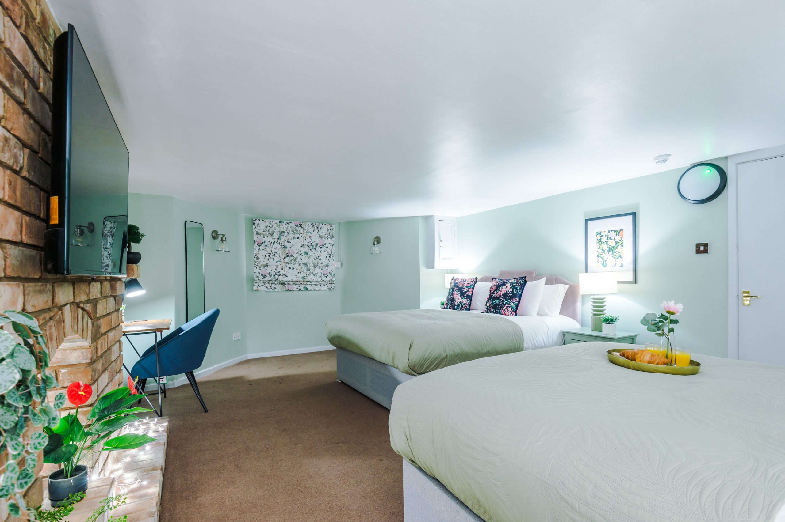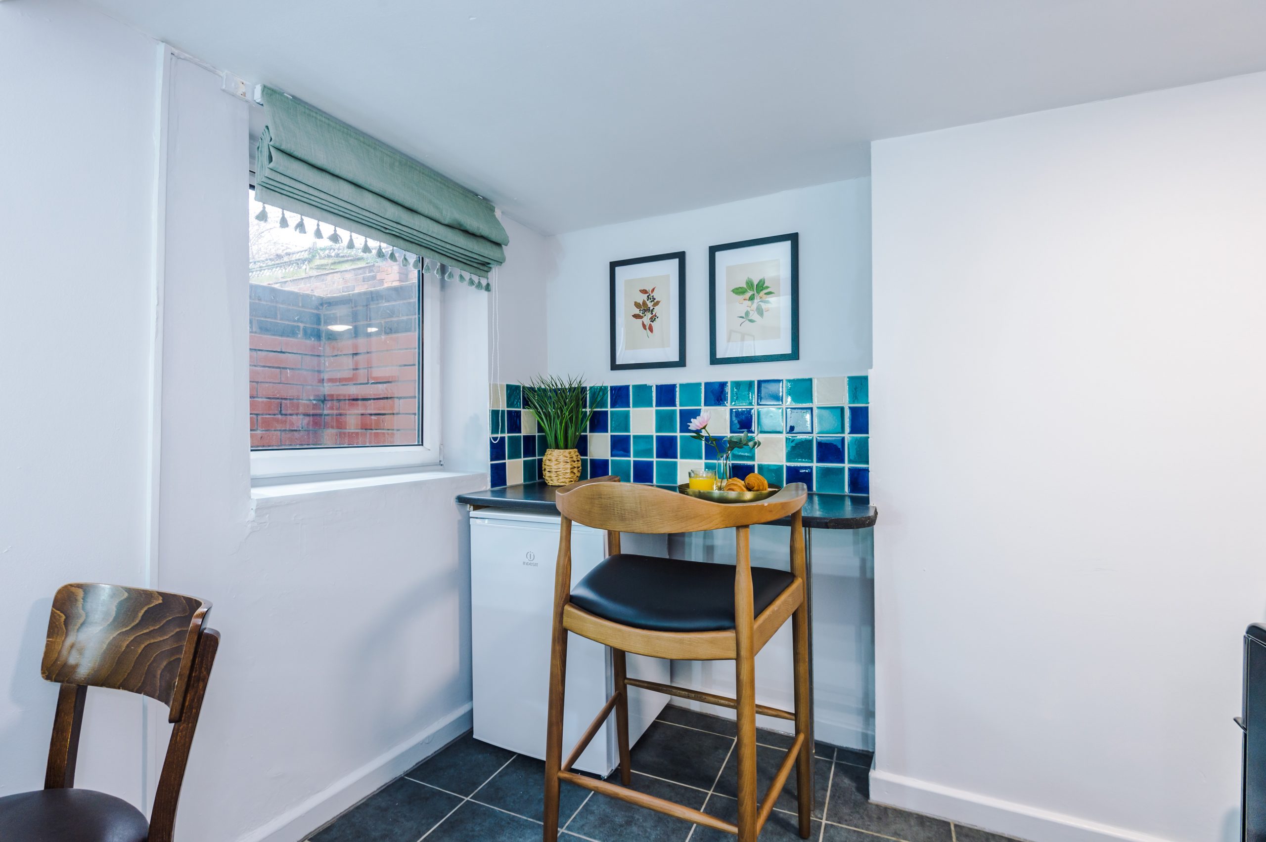 Inside, the apartment features a spacious bedroom furnished with a luxurious king-size bed and soft linens to ensure a restful night’s sleep. The lounge area includes a sleek 50-inch wall-mounted Smart TV with Freeview, plus complimentary access to Netflix, Amazon Prime, and Disney+, all pre-set for easy viewing. A dining table seats four, making it ideal for meals or working remotely.