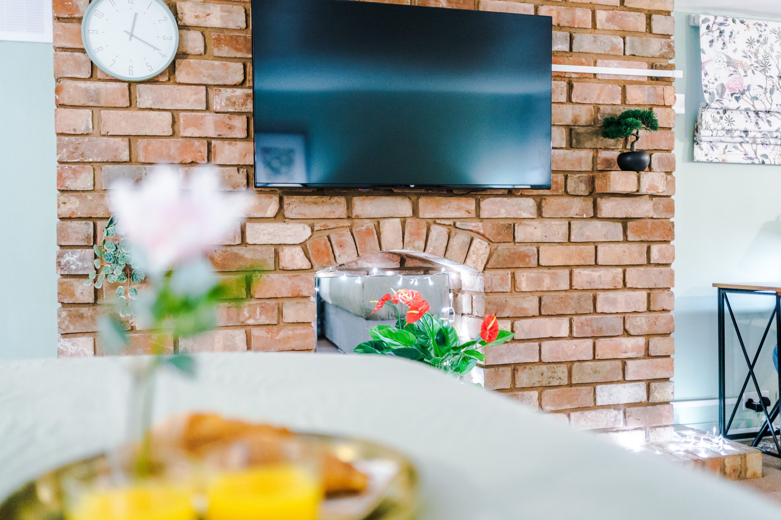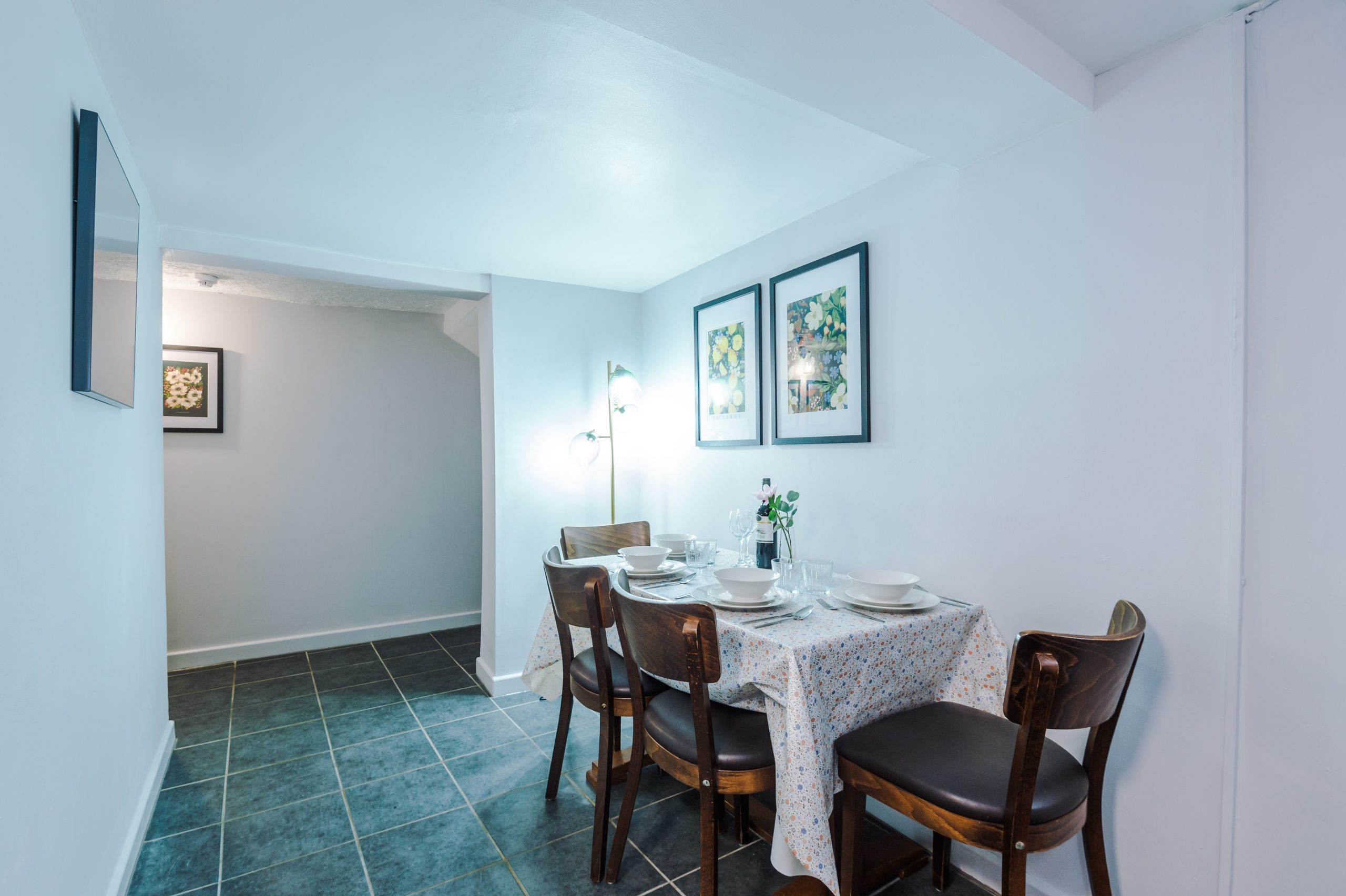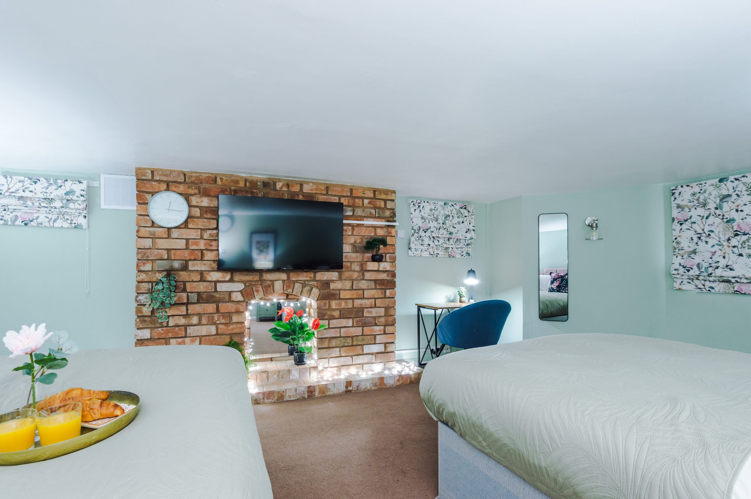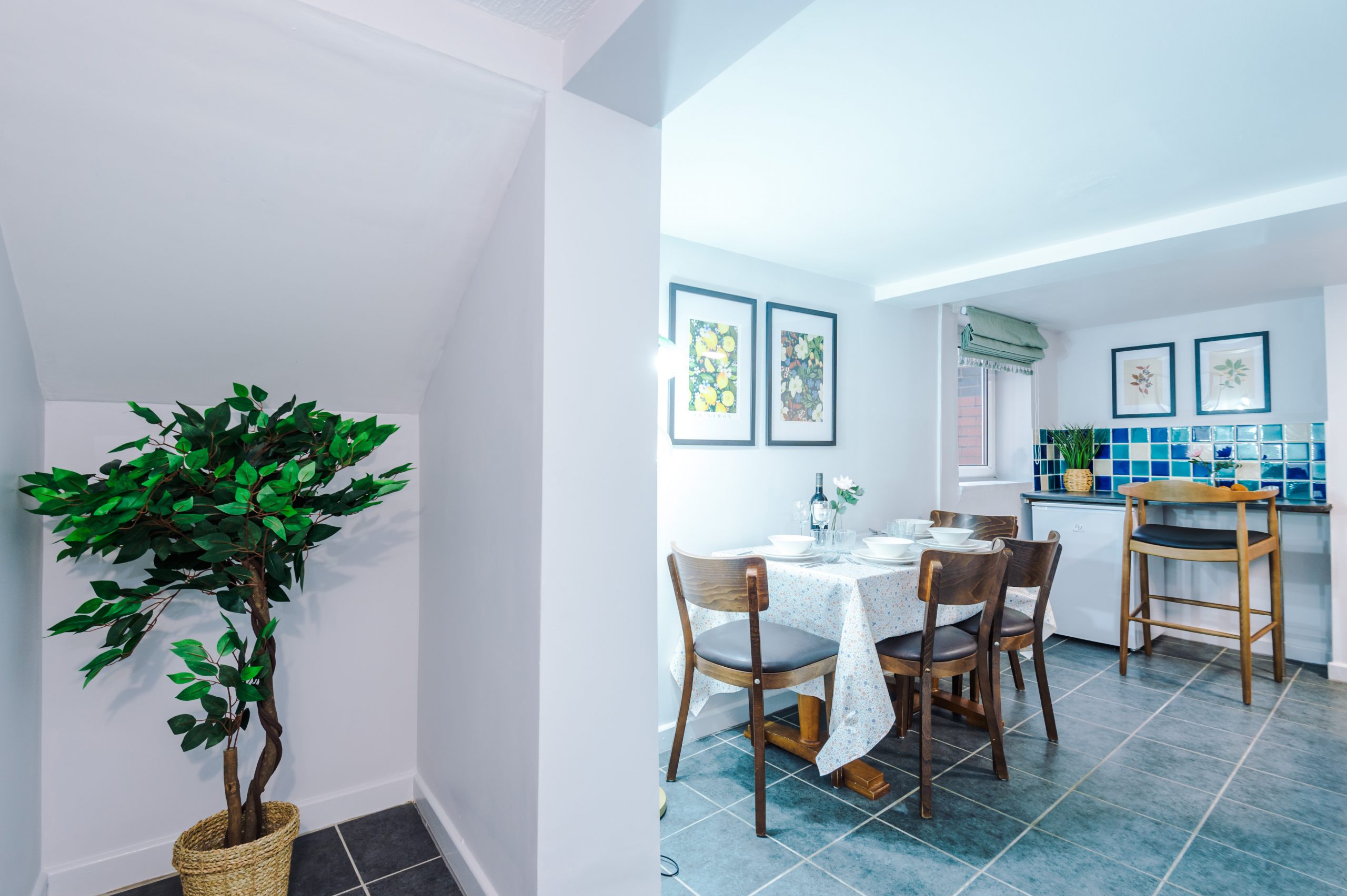Inside, the apartment features a spacious bedroom furnished with a luxurious king-size bed and soft linens to ensure a restful night’s sleep. The lounge area includes a sleek 50-inch wall-mounted Smart TV with Freeview, plus complimentary access to Netflix, Amazon Prime, and Disney+, all pre-set for easy viewing. A dining table seats four, making it ideal for meals or working remotely.