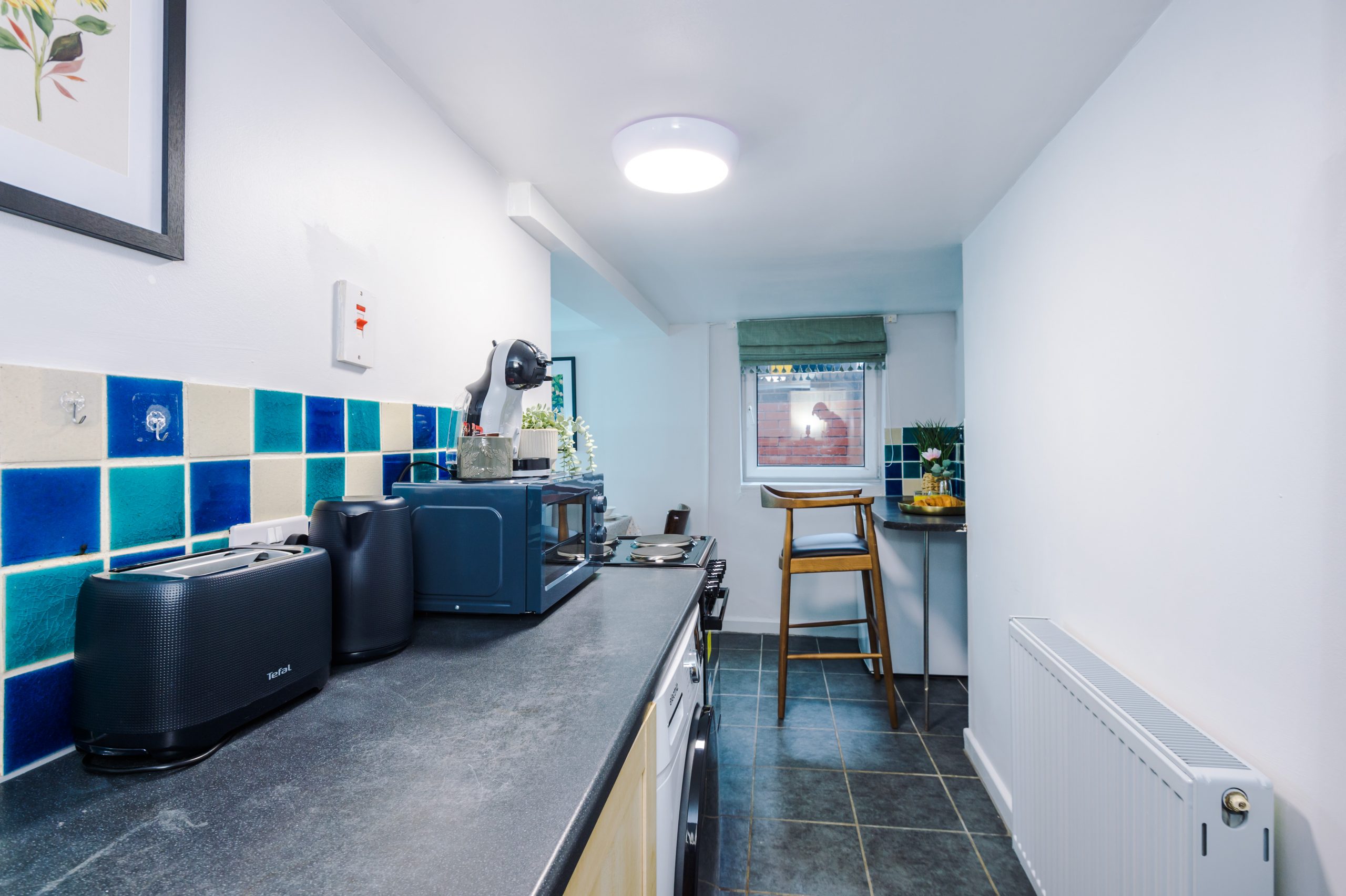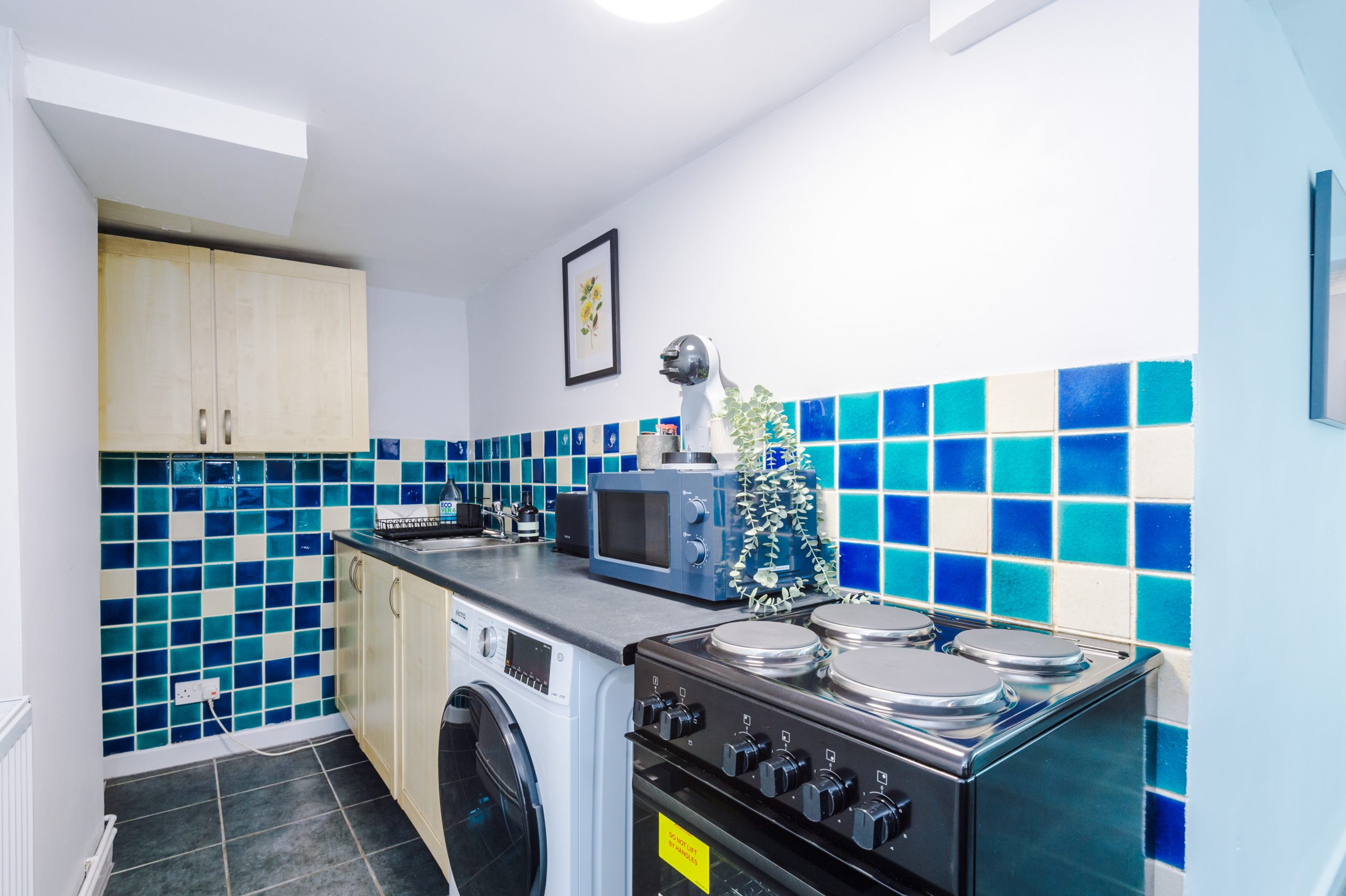 The modern kitchen is fully fitted with everything you need, including a washing machine and dryer, oven, microwave, fridge, and a full set of utensils and cookware. Added touches like a coffee machine with complimentary pods, tea, and kitchen essentials help you feel right at home.