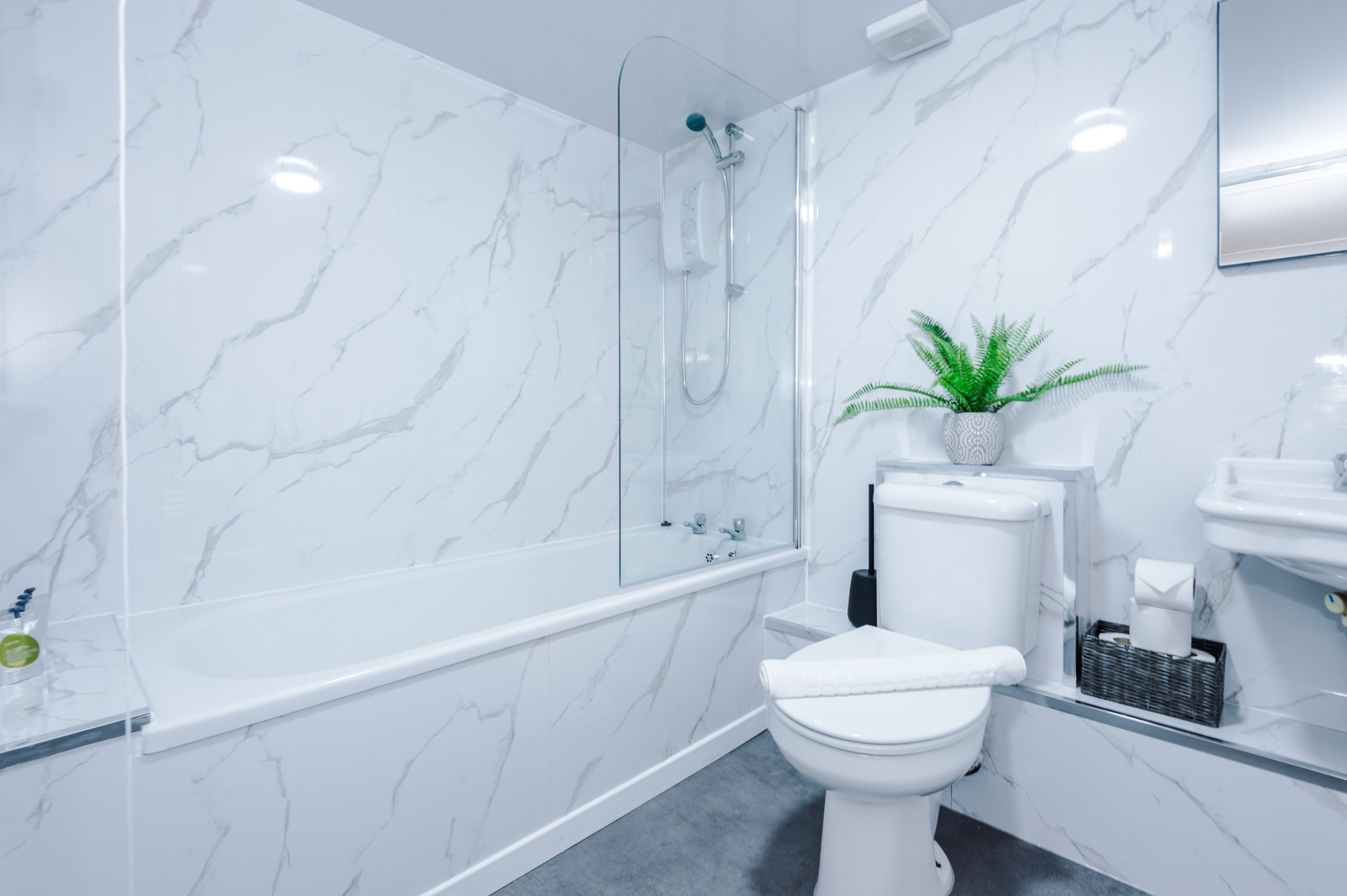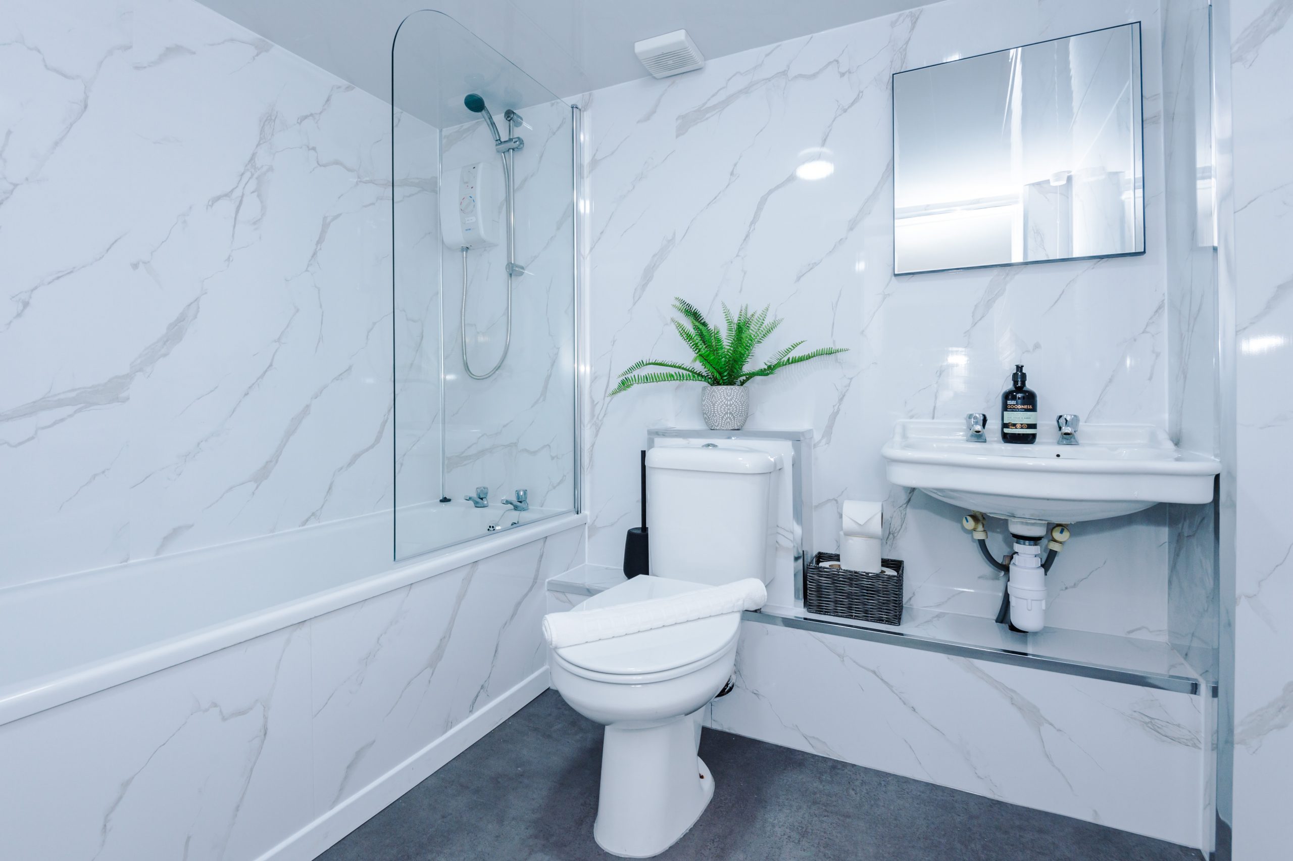 The private bathroom is bright and spotless, with a shower-over-bath, toilet, and basin. Superfast WiFi is available throughout, and you’ll have exclusive access to the entire apartment—no shared spaces. Extra conveniences such as an iron and ironing board, kettle, toaster, and more are also included.