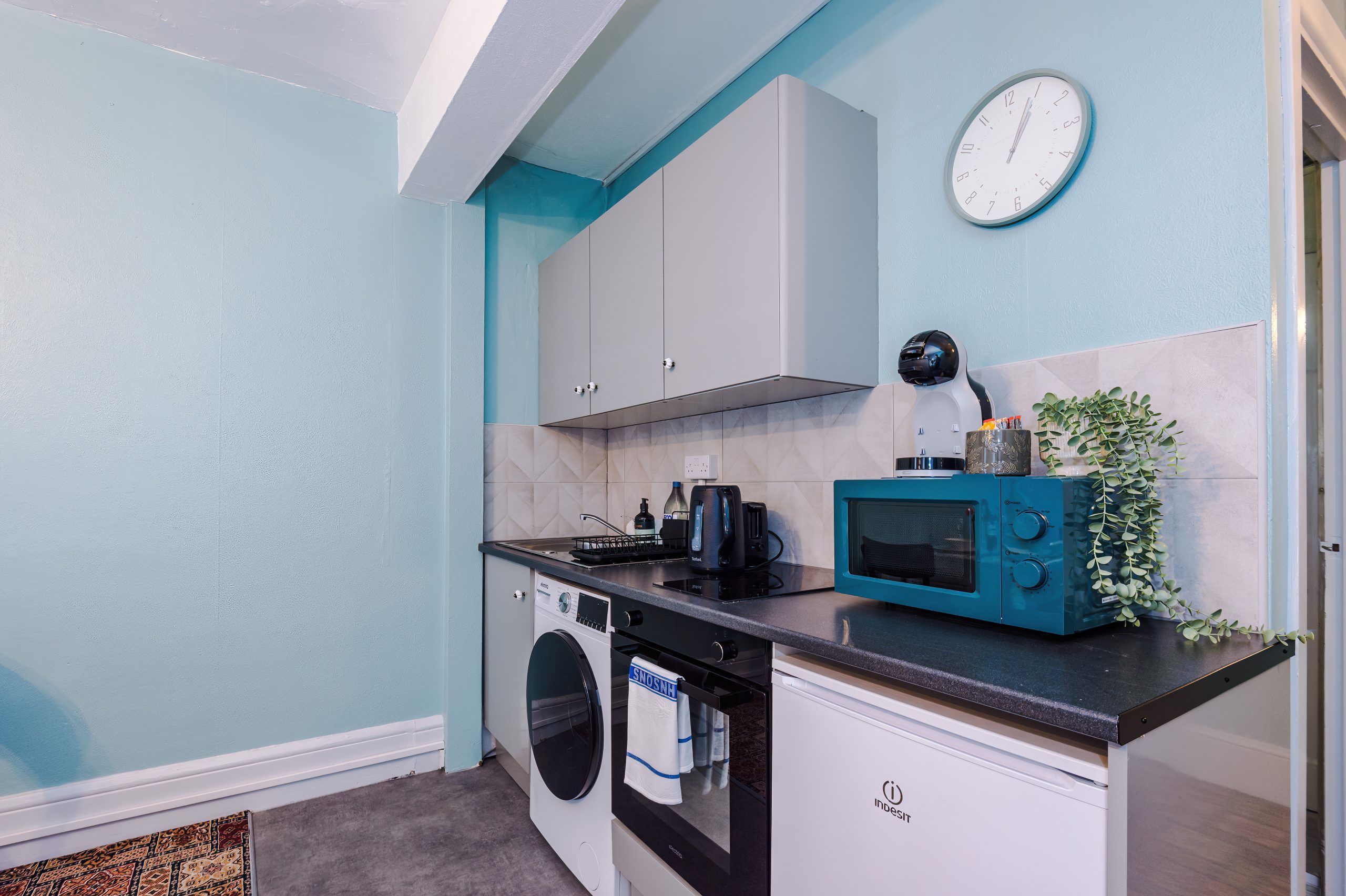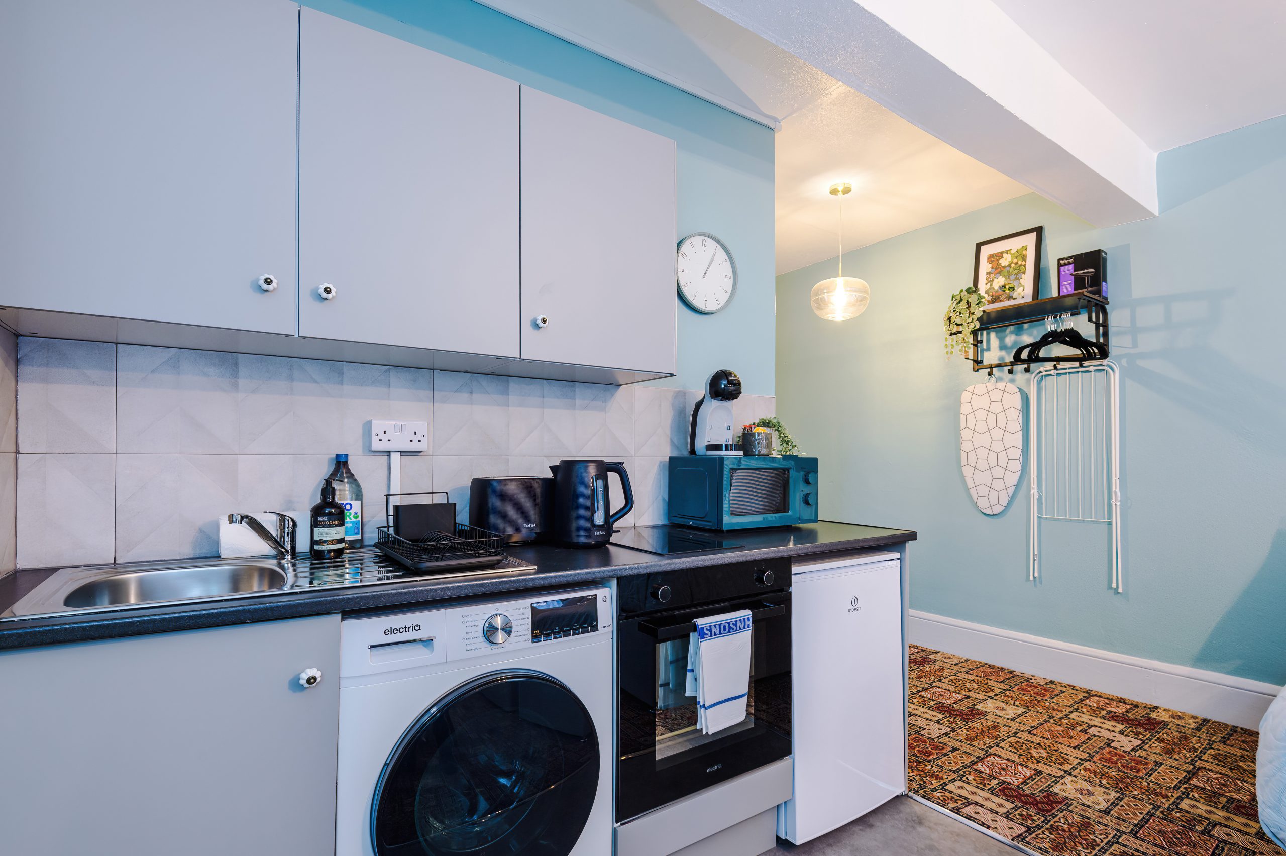The private separate kitchen from the room is fully equipped for all your culinary needs, featuring a washing machine and dryer, fridge, oven, microwave, and all essential appliances, crockery, and utensils. A coffee machine with complimentary pods, tea, coffee, sugar sachets, and a variety of kitchen extras are included to make you feel at home.