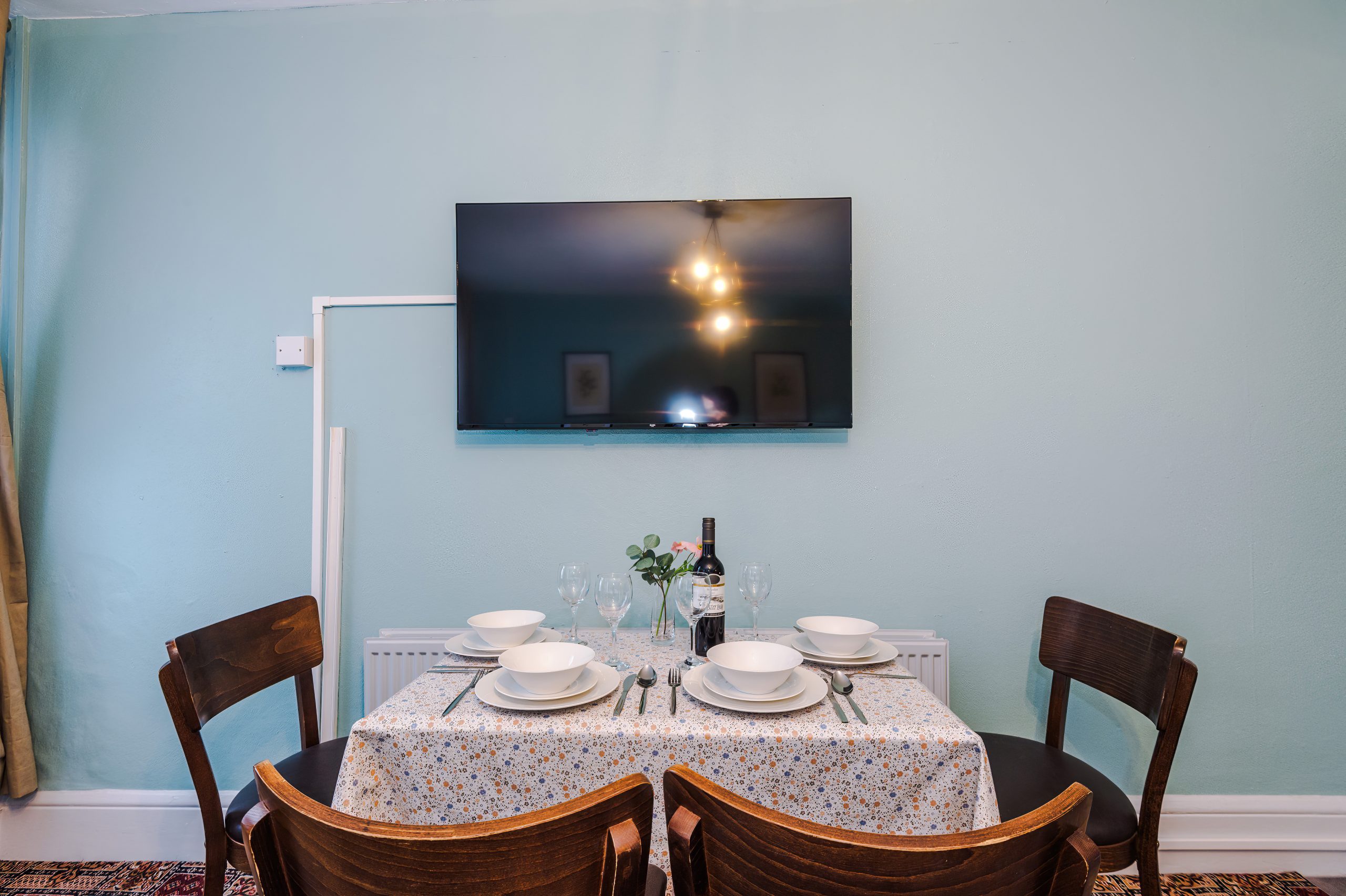 Inside, you’ll find two Double beds with plush bedding, a bedside table for your valuables, and a sleek 50-inch wall-mounted Smart TV offering Freeview, FREE complimentary Netflix, Amazon Prime, and Disney+ at no extra charge (already logged in on the TV for you to binge watch all your favourite shows and movies). The dining area comfortably seats four, providing the perfect space for meals or work.
