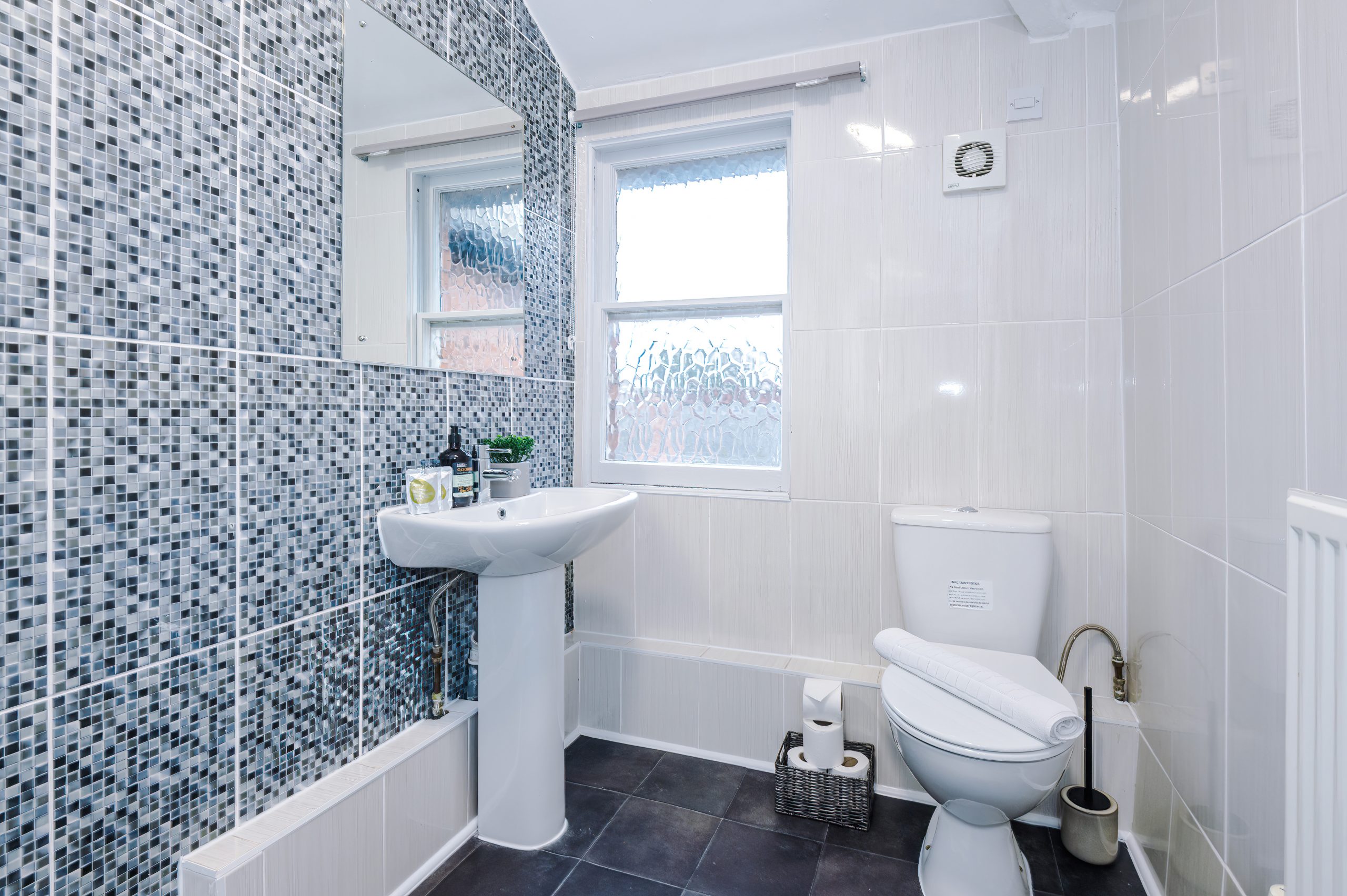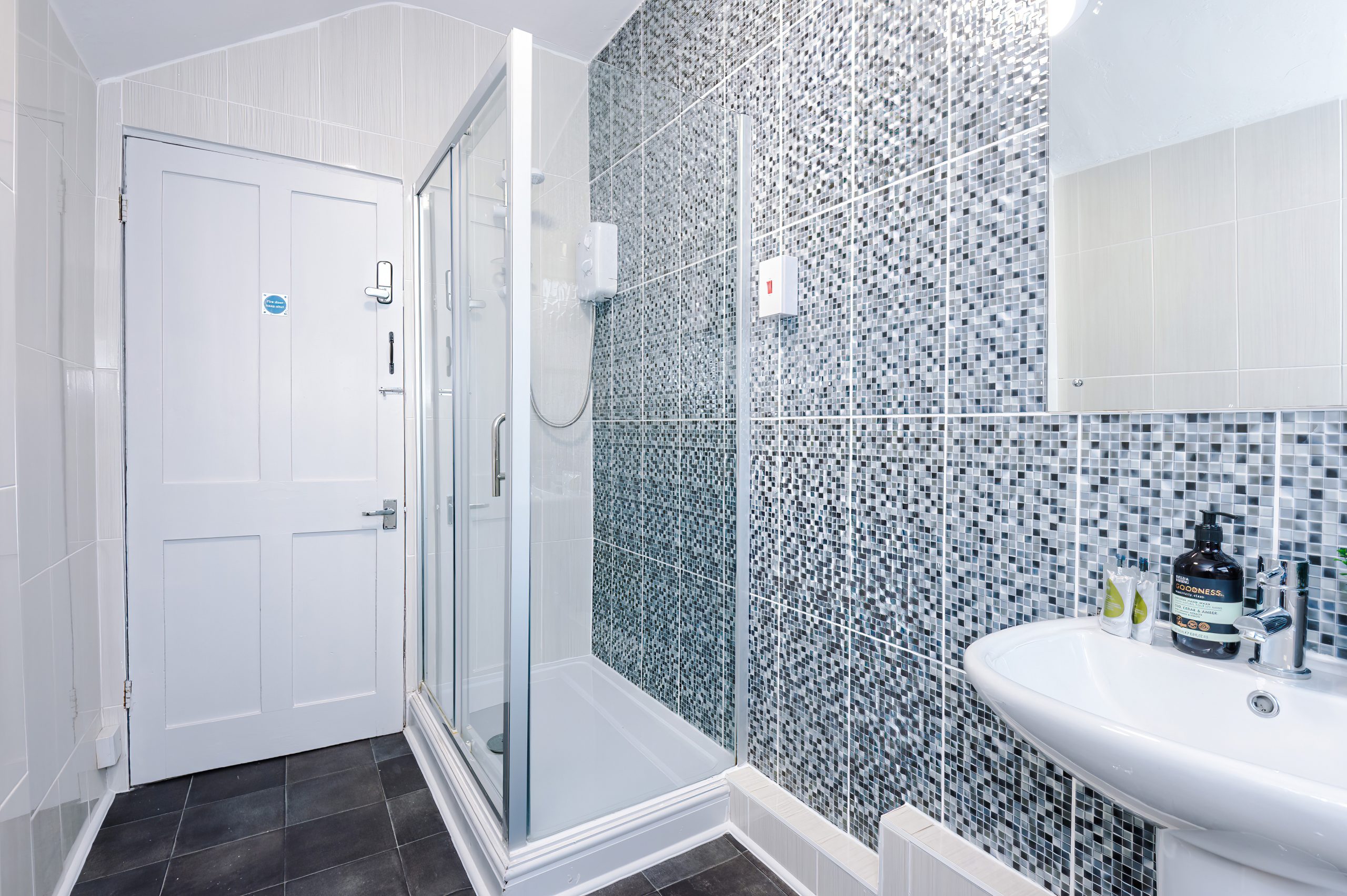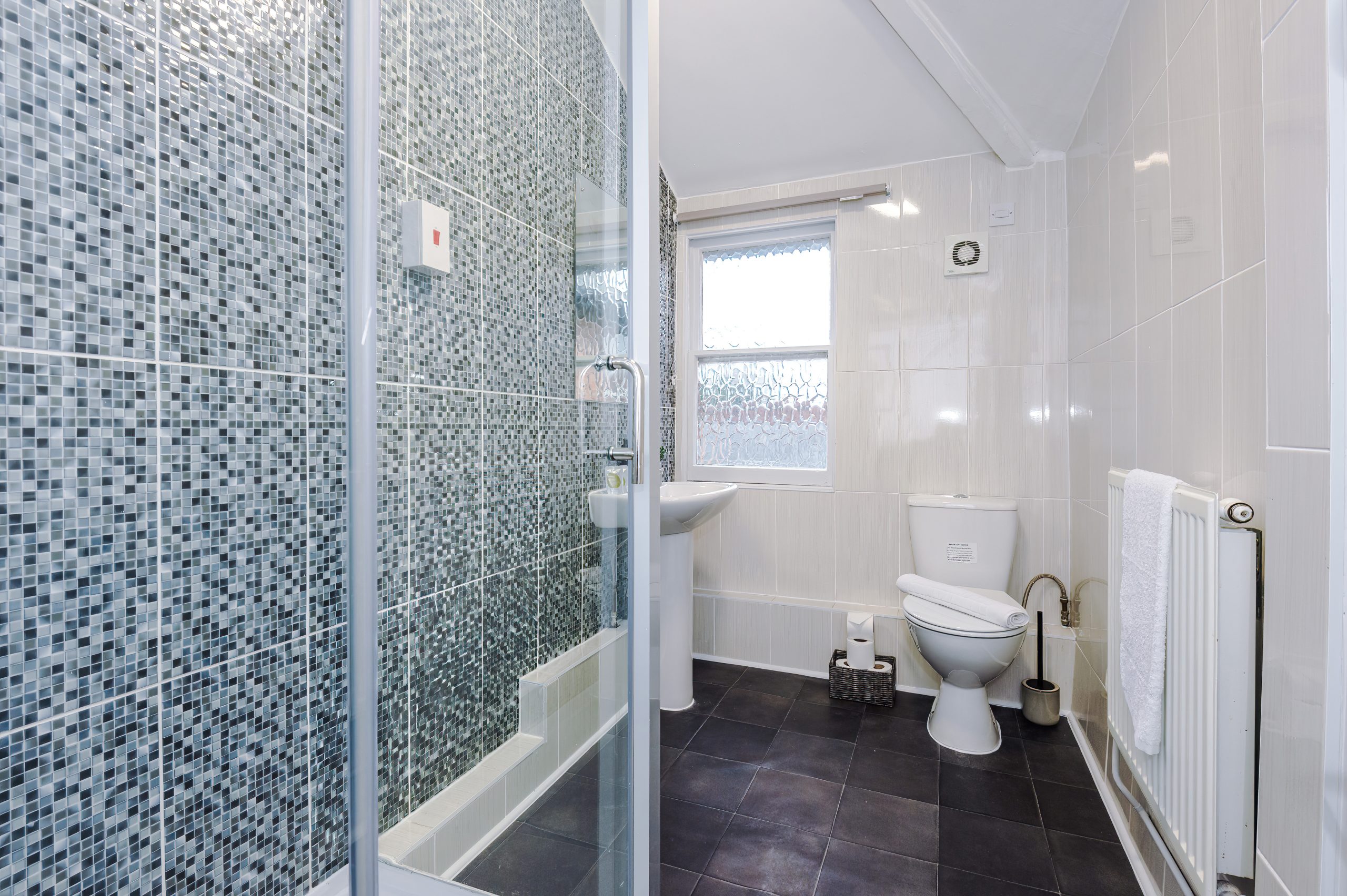 Your private off-suite full shower room is immaculately clean and equipped with a shower, toilet, and sink.