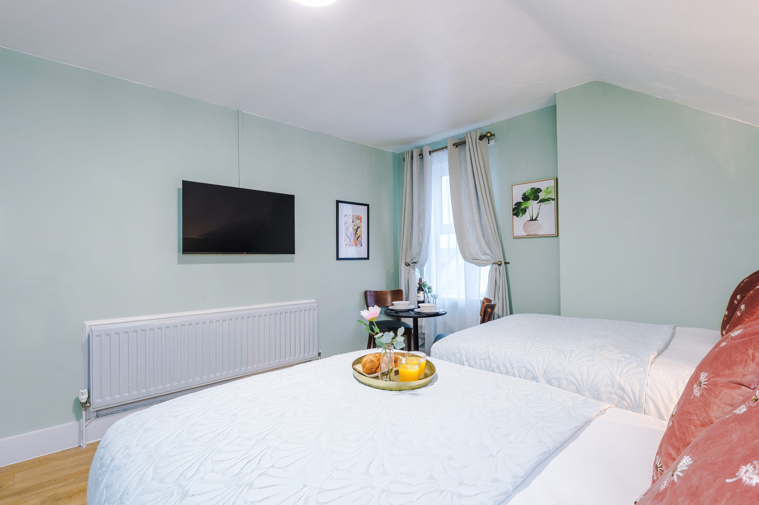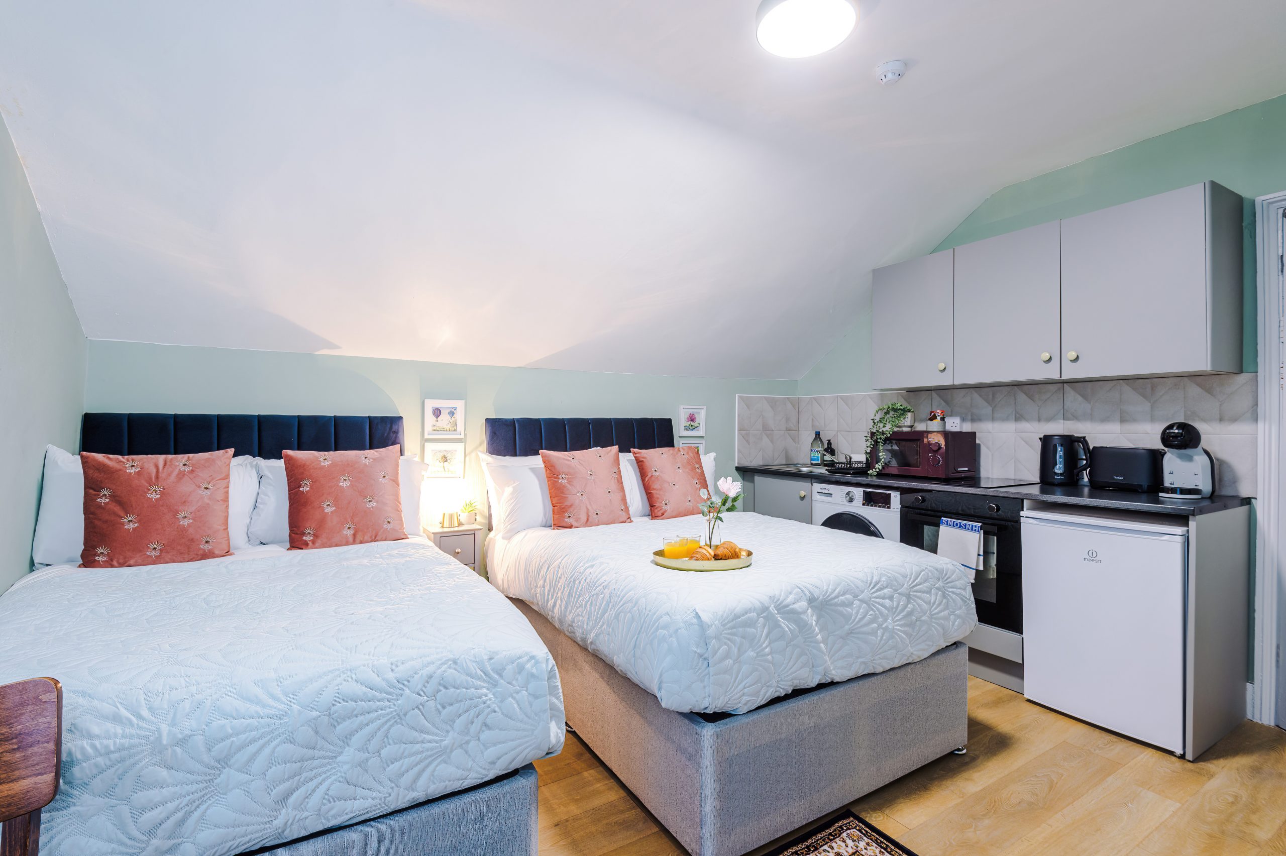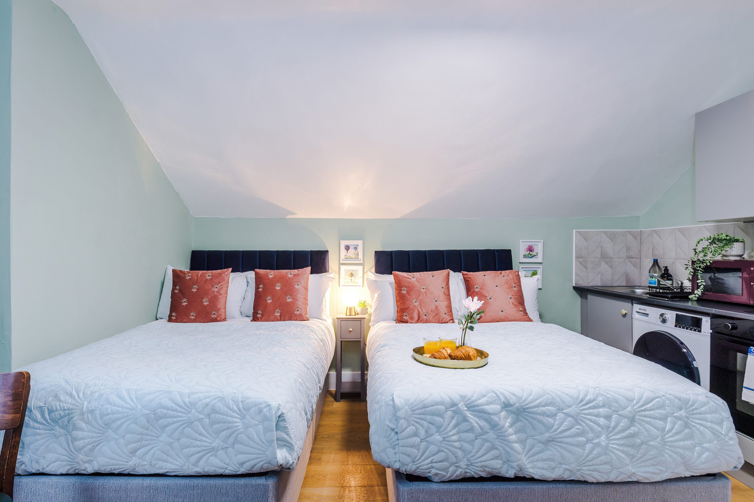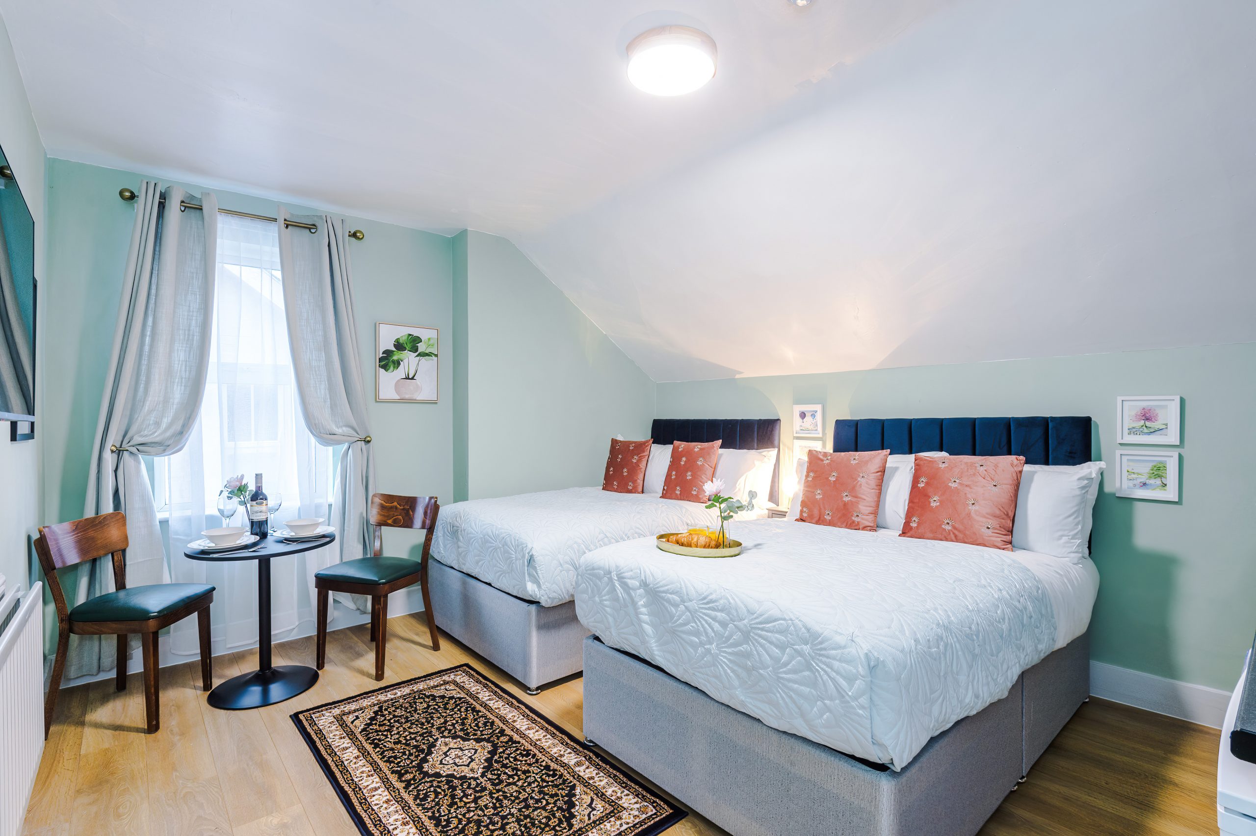 Inside, you’ll find Two Small Double beds with plush bedding, a bedside table for your valuables, and a sleek 43-inch wall-mounted Smart TV offering Freeview, FREE complimentary Netflix, Amazon Prime, and Disney+ at no extra charge (already logged in on the TV for you to binge watch all your favourite shows and movies). The dining area comfortably seats two, providing the perfect space for meals or work.