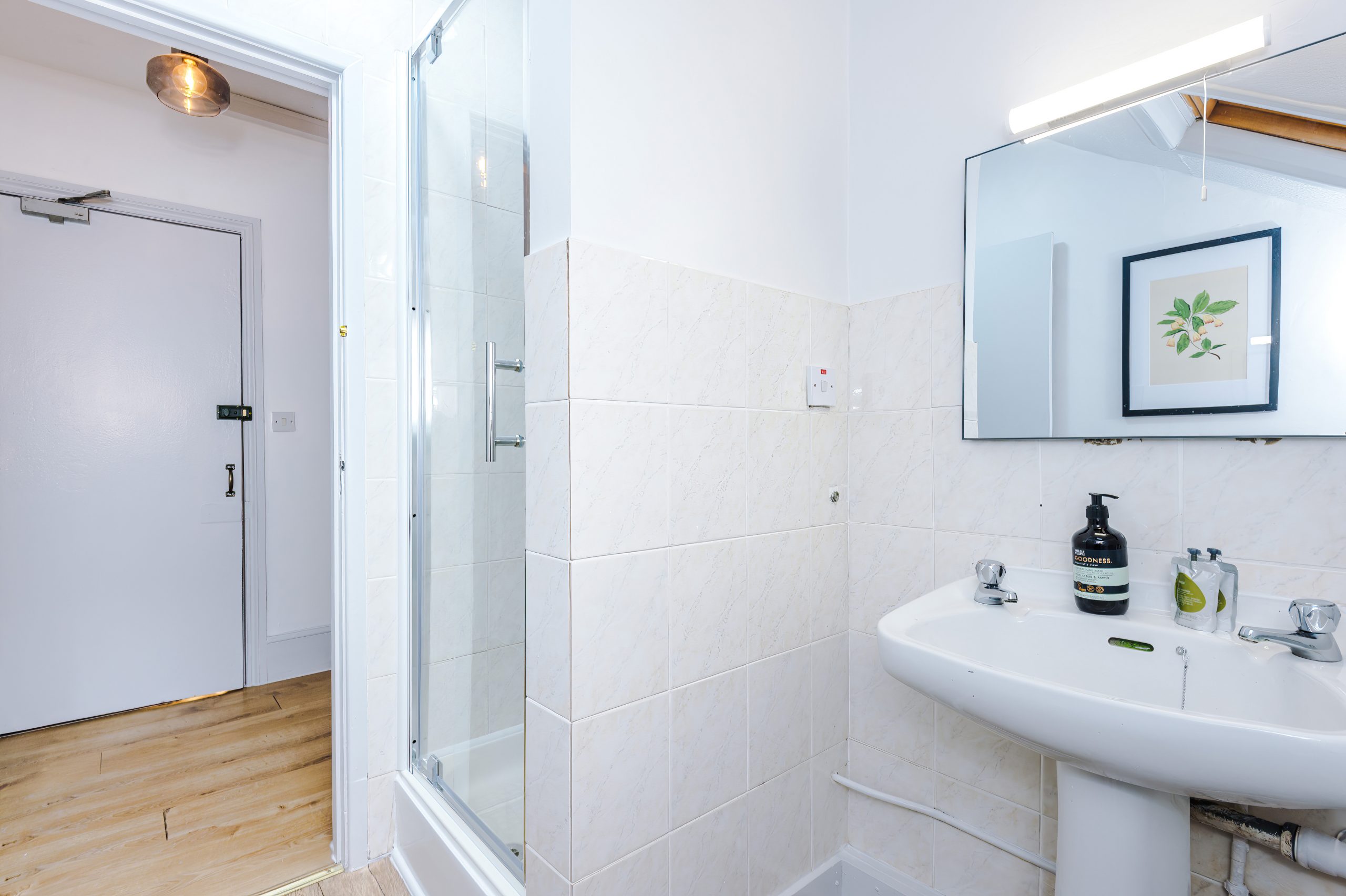 Your private ensuite full shower room is immaculately clean and equipped with a shower, toilet, and sink. The entire studio is on a single level, ensuring accessibility for all.